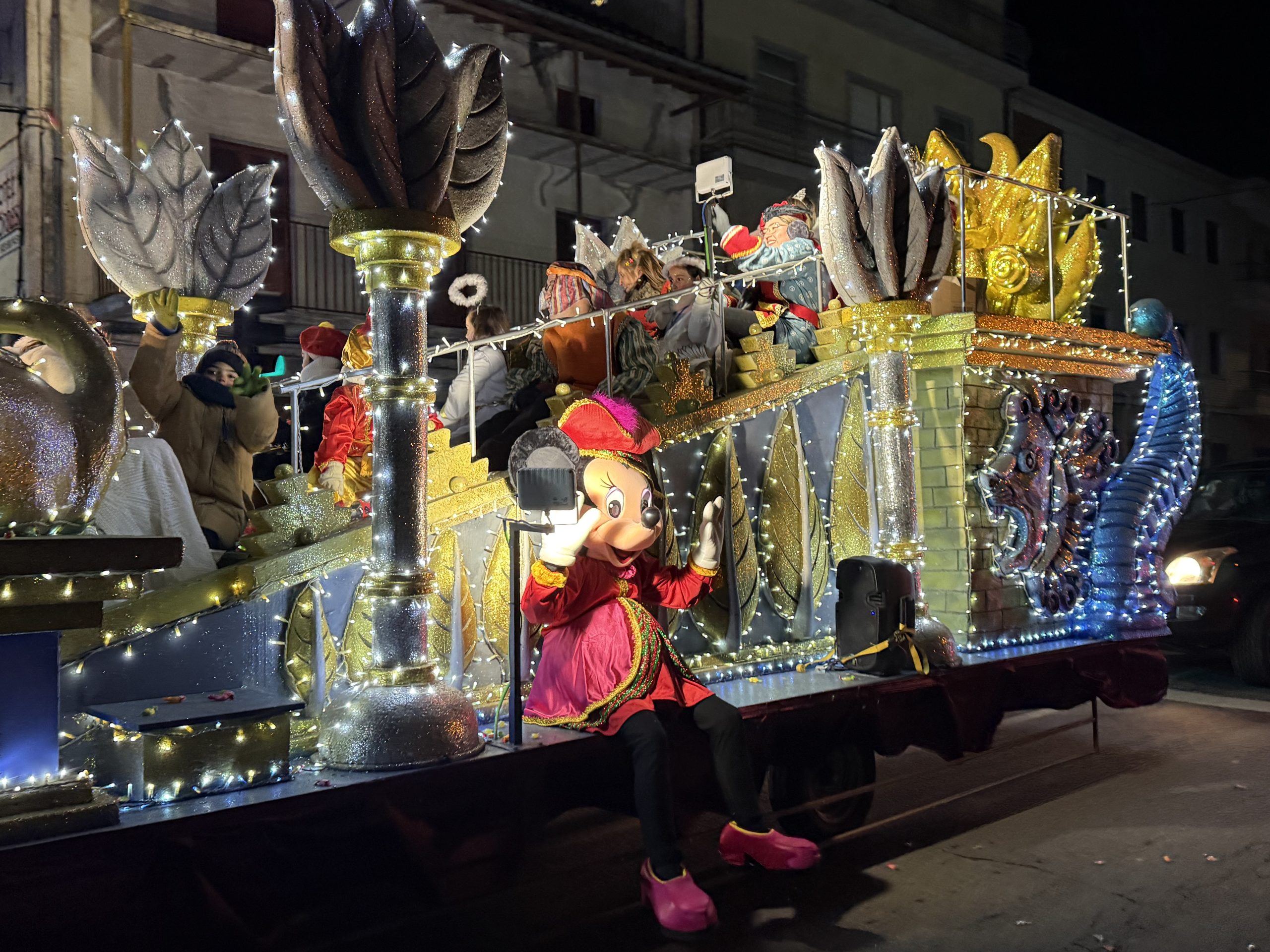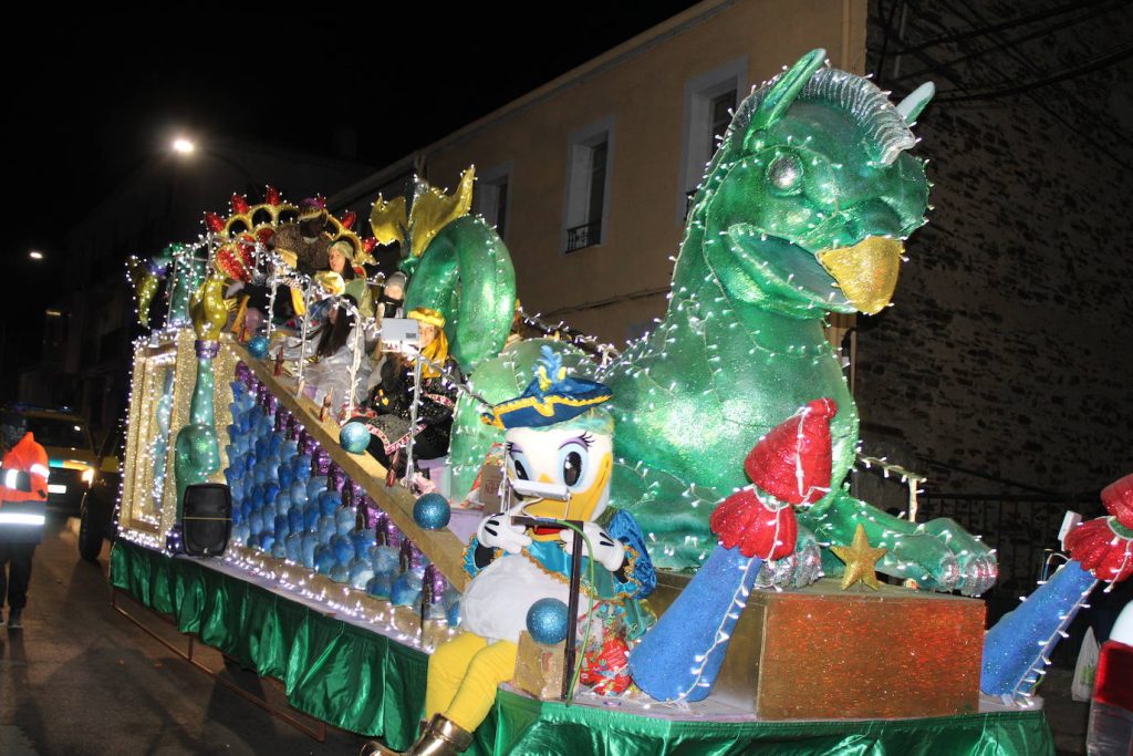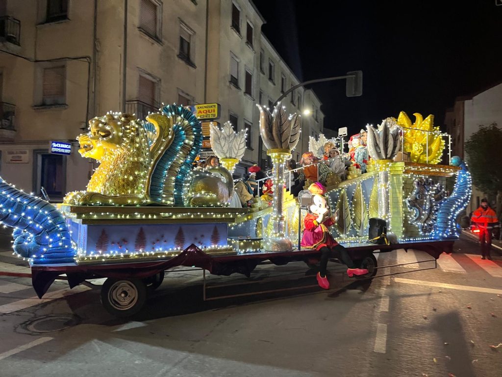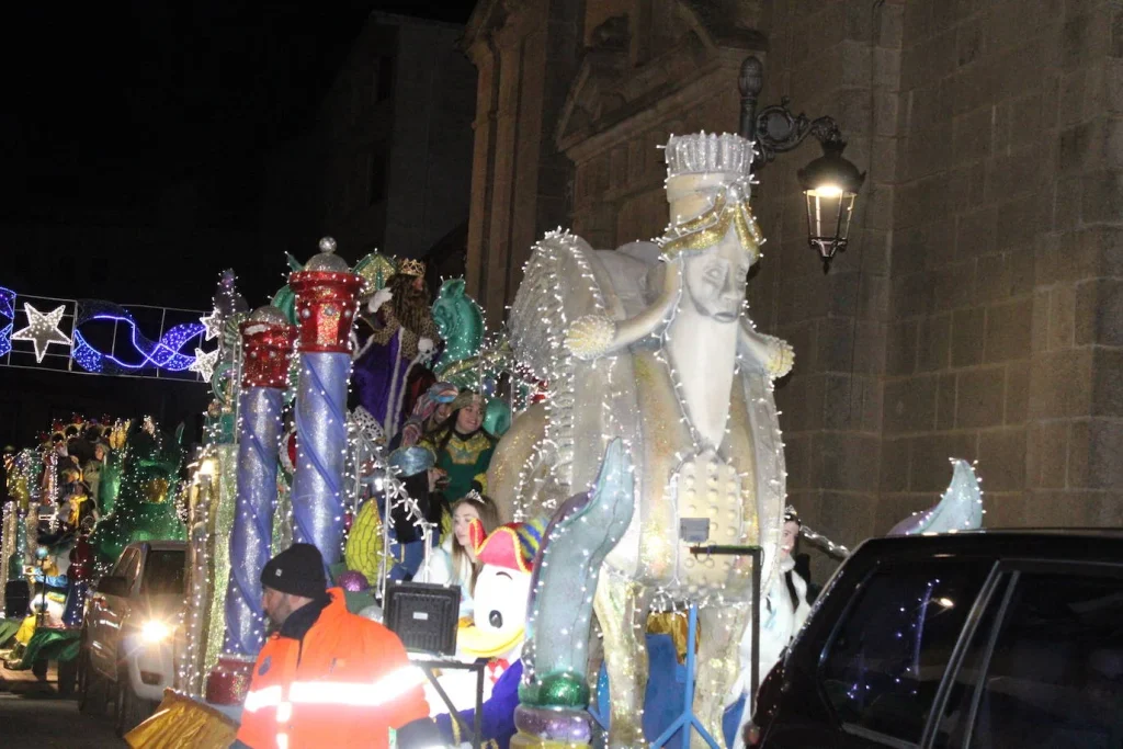 Sus Majestades los Reyes Magos de Oriente llegaron a Guijuelo en una espectacular cabalgata, recorriendo las calles en carrozas reales acompañados de sus pajes y ayudantes. El desfile estuvo animado por cuatro conocidos personajes de Disney —Mickey, Minnie, Donald y Daisy— que aportaron aún más magia y diversión a una tarde muy especial.