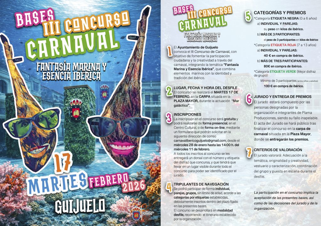 El Ayuntamiento de Guijuelo convoca el III Concurso del Martes de Carnaval, que se celebrará el martes 17 de febrero de 2026, en la carpa de la Plaza Mayor, coincidiendo con el espectáculo musical “Mar Galáctico”.