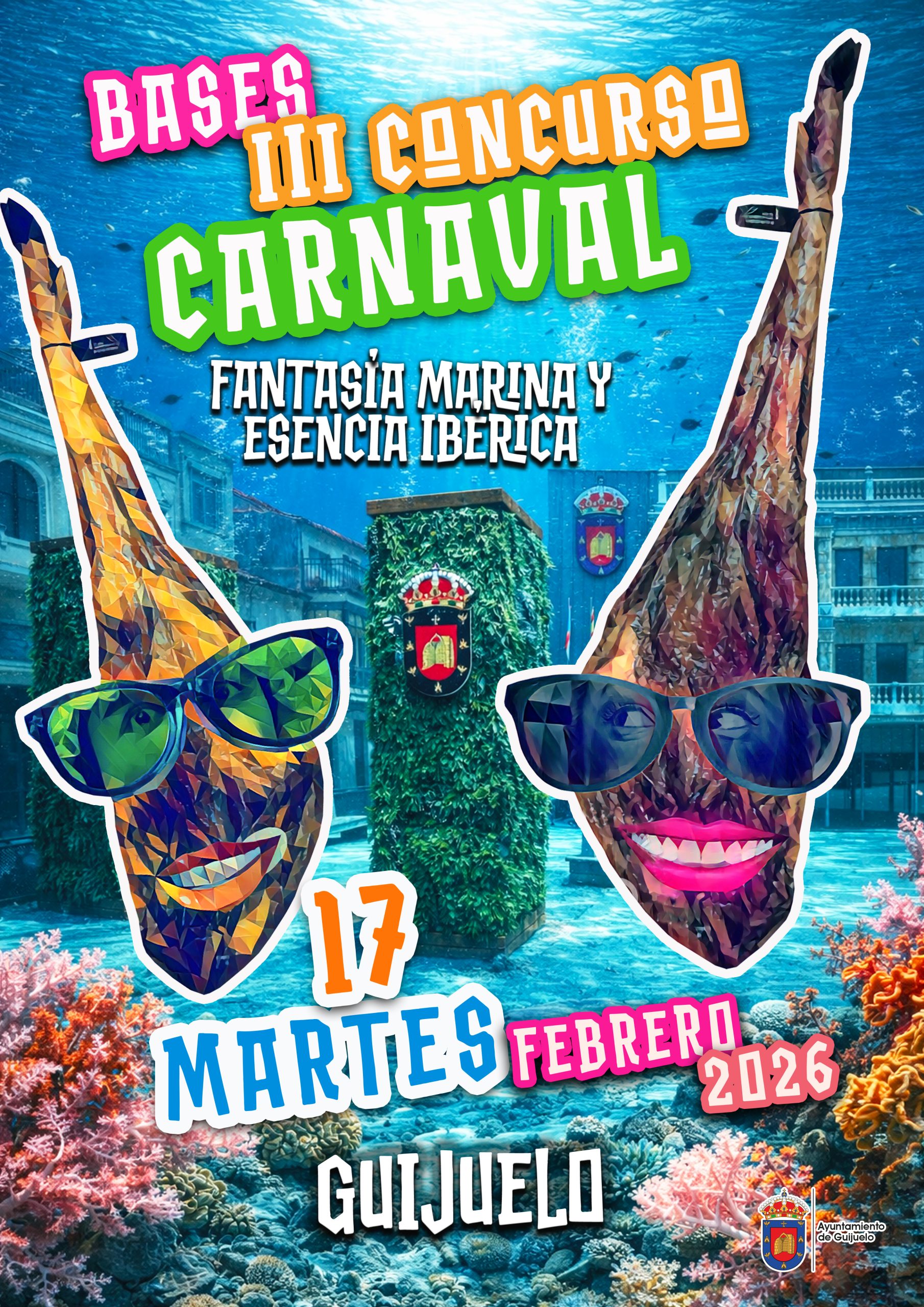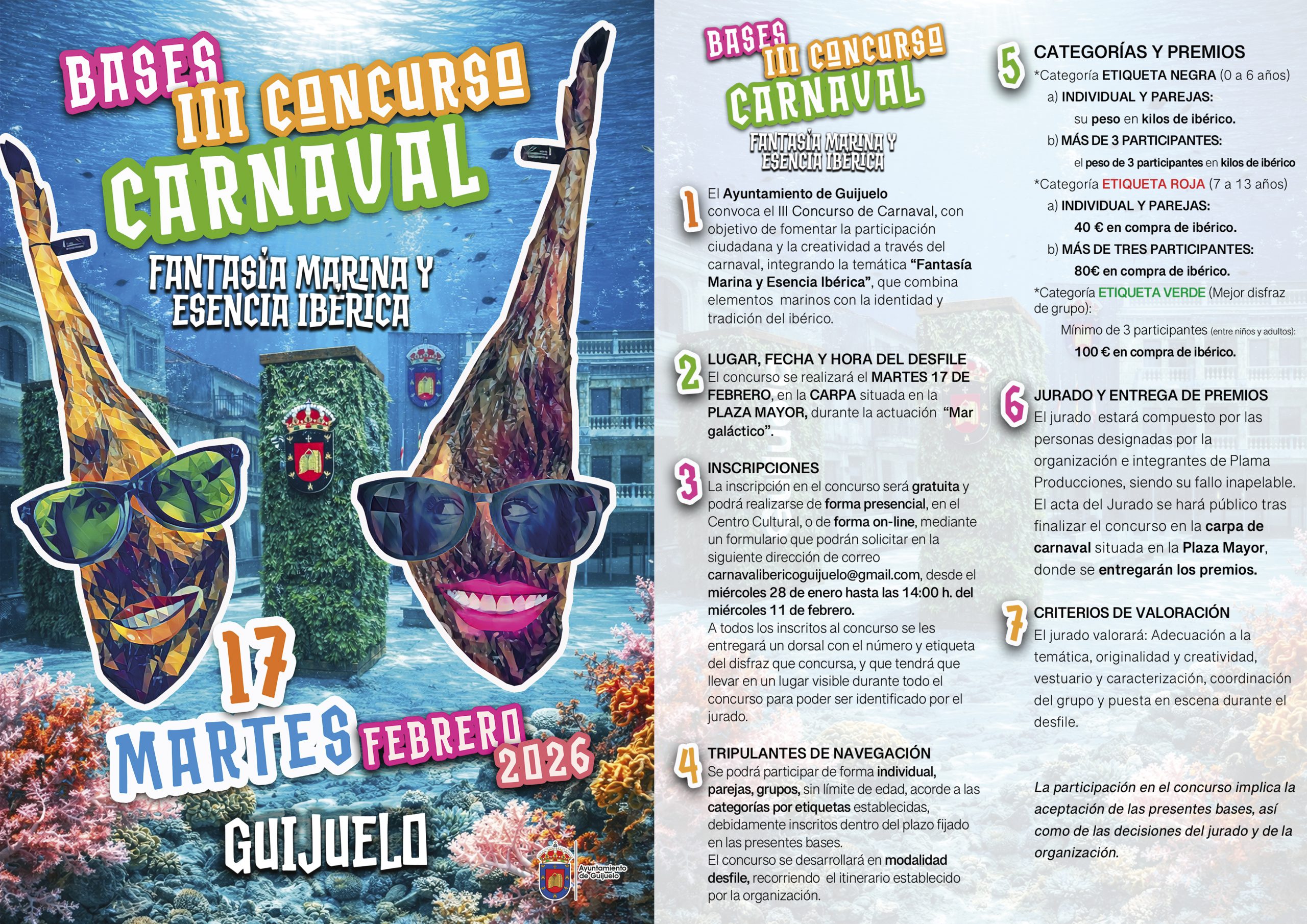 El Concurso tiene como objetivo fomentar la participación ciudadana y la creatividad, uniendo el espíritu del carnaval con una temática original y muy ligada a la identidad local: “Fantasía Marina y Esencia Ibérica”, que combina elementos del mundo marino con la tradición del ibérico.