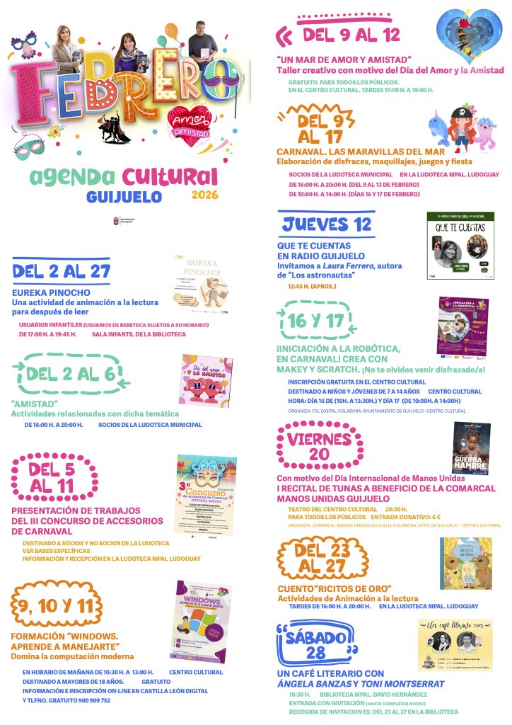 El Ayuntamiento de Guijuelo, a través del Centro Cultural, la Biblioteca Municipal y la Ludoteca Municipal Ludogüay, presenta una completa programación cultural para el mes de febrero, con actividades dirigidas a todos los públicos.