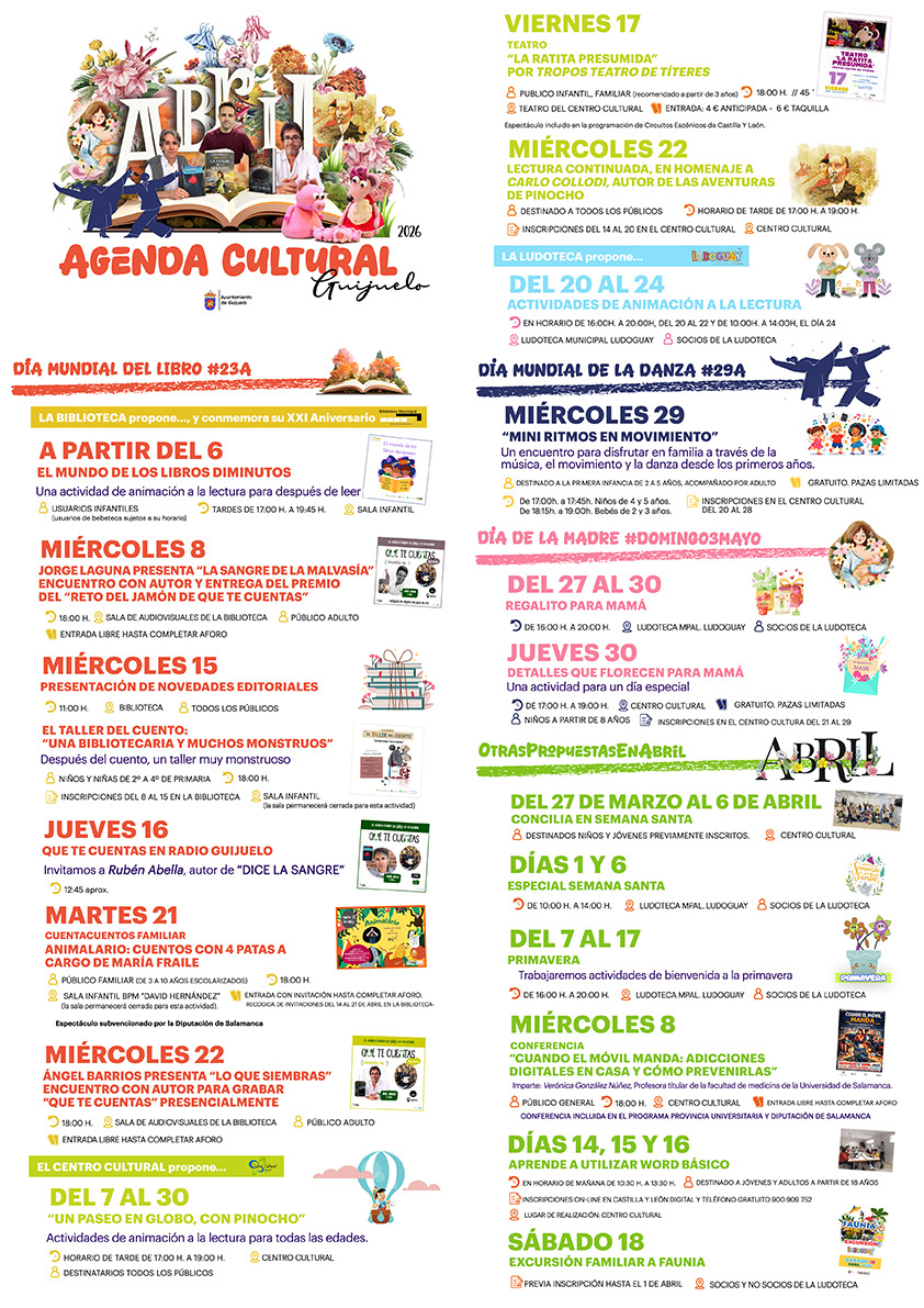 El mes de abril llega a Guijuelo con una completa programación cultural centrada en dos grandes citas: el Día Mundial del Libro (#23A) y el Día Mundial de la Danza (#29A). La Biblioteca, el Centro Cultural y la Ludoteca Municipal han preparado una agenda repleta de propuestas para todos los públicos.