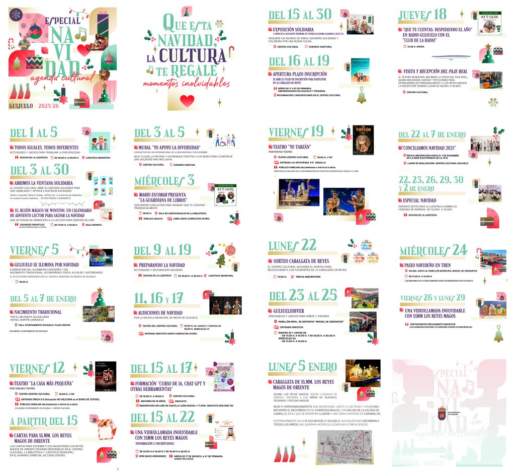 Con este mensaje, el Ayuntamiento de Guijuelo presenta su Agenda Cultural de Navidad 2025/2026, organizada por el Centro Cultural, la Biblioteca Municipal David Hernández y la Ludoteca Municipal. Una programación diseñada para disfrutar en familia, promover la solidaridad e impulsar actividades inclusivas, culturales y educativas.