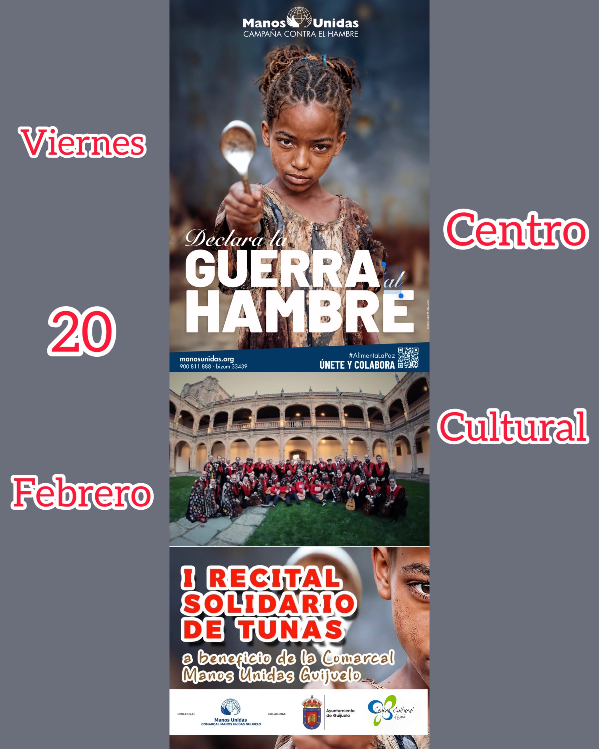 El Centro Cultural de Guijuelo volverá a convertirse en escenario de la solidaridad con la celebración del I Recital Solidario de Tunas, organizado a beneficio de la Comarcal Manos Unidas Guijuelo.